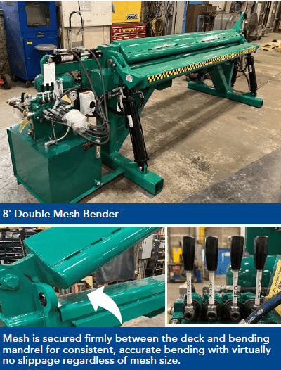 • Hydraulic cylinders mounted in the bending deck providing unobstructed bending for the full range of (WWR) mesh including D21 on 2″ centers. Or D32 on 4″ centers