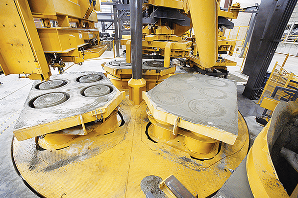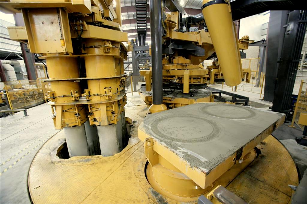 - A pan-type swipe feeder automatically positions over the form in the fill station and begins to feed and consolidate concrete by vibration into the form set.