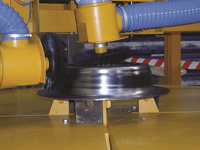 Fully automated, multi-axis-controlled cleaning robot for gentle and rapid cleaning of base pallets. Special scrapers carefully scrape both coarse and fine concrete residues from inner and outer edges. A rotating, CNC-controlled, steel wire brush cleans the profile of the base ring pallet. Brush pressure is regulated automatically and remains constant even when brushes show wear. Operators can set up the BFS PUMA for the cleaning of new base pallet types or new diameters themselves with the aid of simple teach-in programming. Powerful dust extraction systems and machine housings are available as additional options.