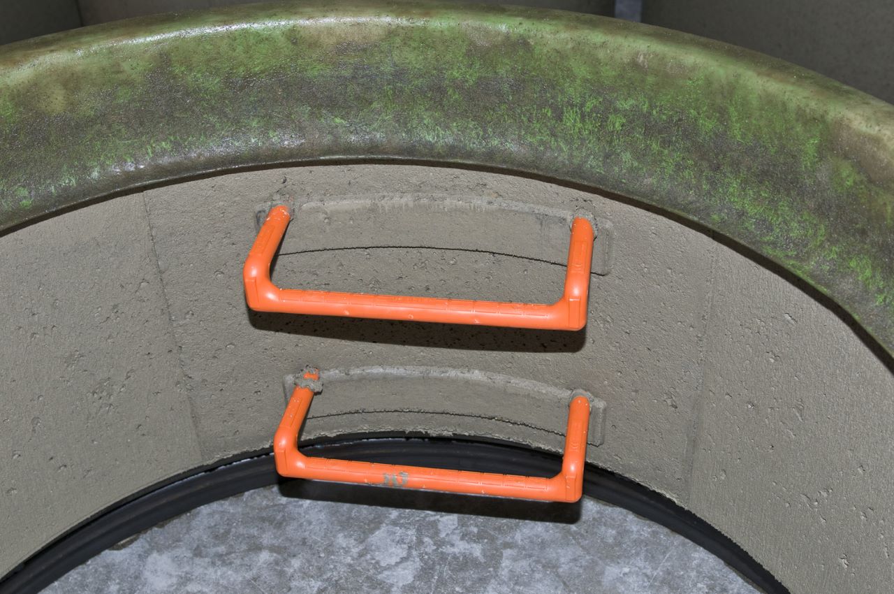 With Karibic, step elements can be inserted manually, semi-automatically or automatically into the mold unit. This can also be done in conjunction with, and at the same time as, inserting the steel reinforcement hoops. BFS has a patent on this process. Reinforcement and step elements, such as cast iron or rungs, are then automatically cast-in-place during compaction.