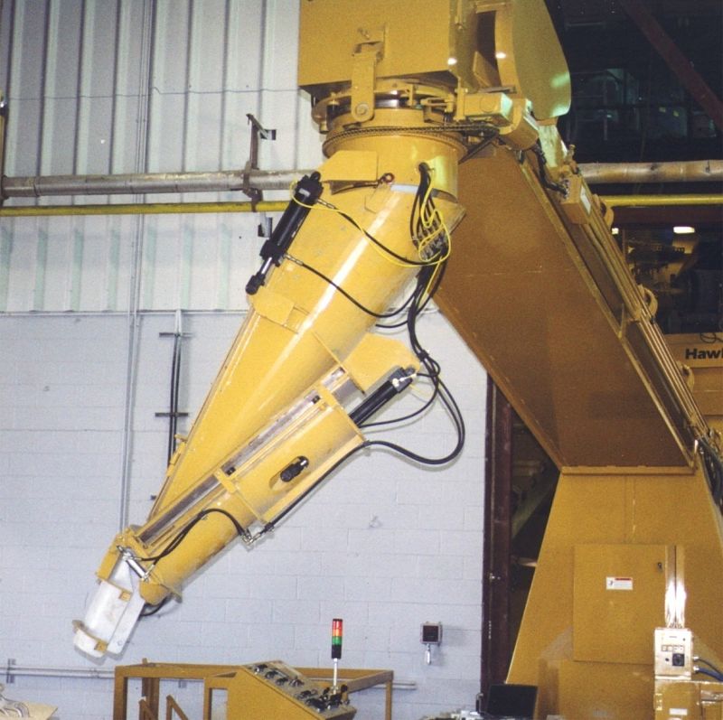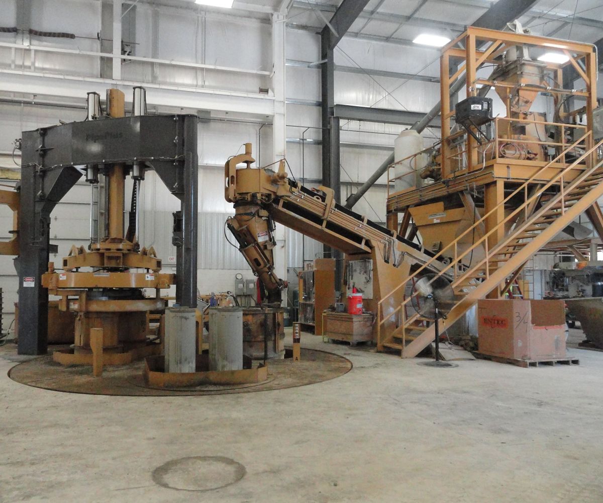 - A concrete distributor chute automatically adjusts to the form size in the fill station and begins to feed concrete into the form.