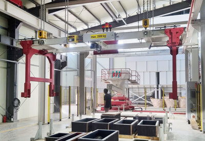 The Prima Fit system for wetcast concrete product production is a modular system that uses a vertical stacking process to maximize factory floor space.
