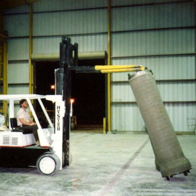 Torpedo tippers can tip two concrete pipes at a time to quickly clear pipe from the curing area. The tippers are mounted to the end of the truck forks. The roller-guided pivoting extensions initially hang vertically and are lowered into the top of the pipe barrel. After insertion, the operator backs the fork truck and lowers the fork’s to tip the pipe. Once tipped, the fork truck drives forward to insert the truck’s forks into the pipe for transport.