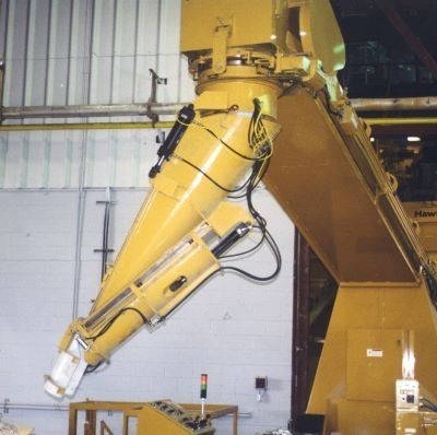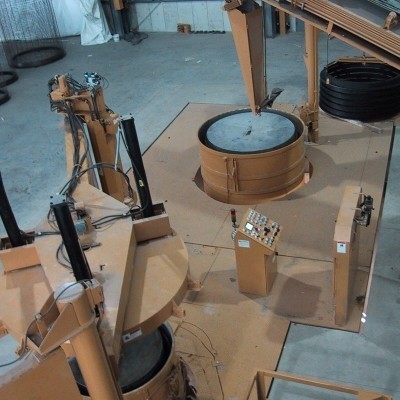 - After the mold is filled, vibrated and pressheaded, an overhead crane is used to offbear the finished concrete product from the machine fully supported in the external jacket.